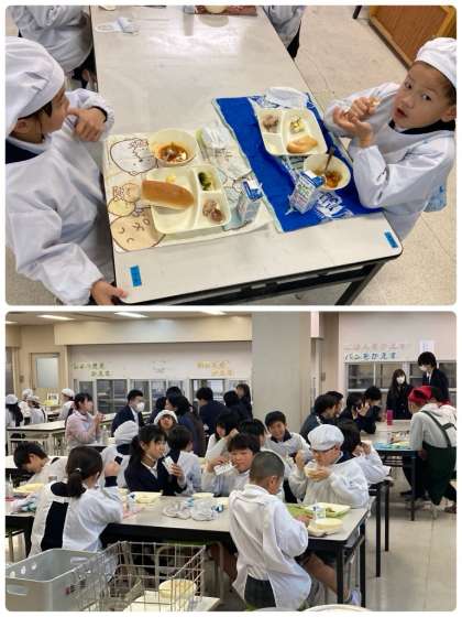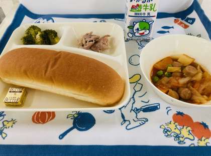今日の献立は「鶏肉のバジル焼き、ウインナーと野菜のケチャップ煮、ブロッコリーのサラダ、コッペパン、バター、牛乳」でした。