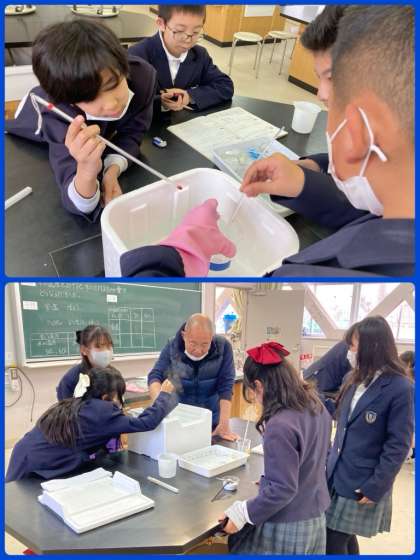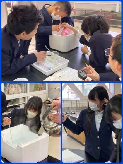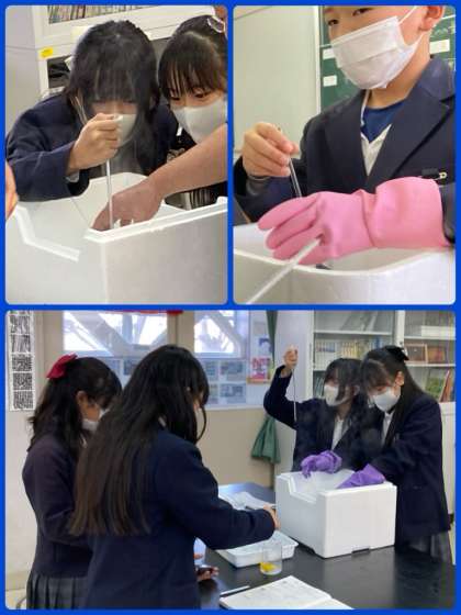 5年生は理科で、もののとけ方について学習しました。変える条件と同じにする条件に気をつけながら、水の量と温度に注目して実験を進めました。自分たちの予想と照らし合わせながら、変化の様子を見逃すことなく班で確かめていきました。
