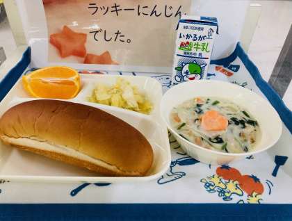 今日の献立は「ほうれんそうのクリームシチュー、キャベツのサラダ、デコポン、黒糖パン、牛乳」でした。ほうれんそうのクリームシチューはラッキーにんじん入りでした。