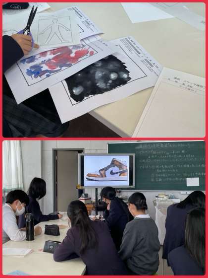 7年生は美術で、着てみたい服をデザインしました。自分のイメージや気持ちを表現するための色々な方法を学び、偶然に生まれる形や色の美しさを発見していきました。