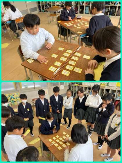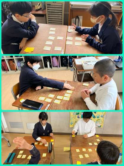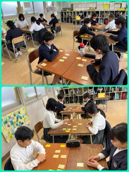 4年生は、百人一首の黄札のトーナメント戦を行いました。前年度、赤札と青札で異学年交流戦を行いました(※2022年度の2年と3年のトップページ参照)。今回のクラスでの試合も、白熱した好勝負が続いたようです。
