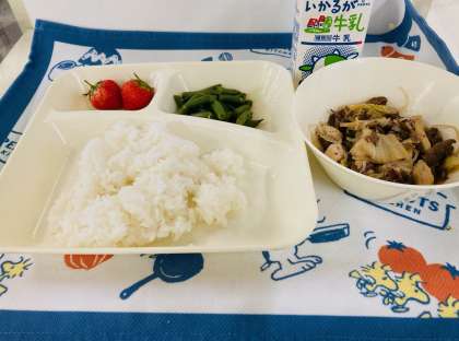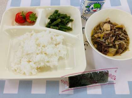 今日の献立は「すきやき煮、さんどまめのごまあえ、いちご、中学校:焼きのり、ごはん、牛乳」でした。おはしの持ち方を意識することで、食事がしやすくなります。