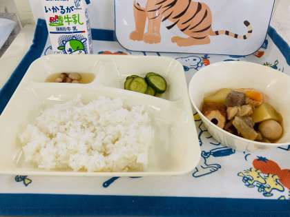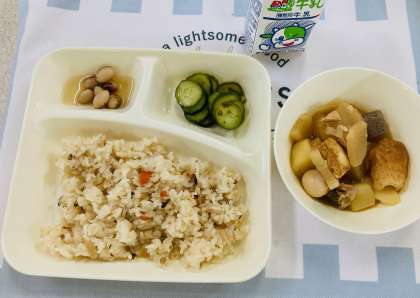 今日の献立は「関東煮、きゅうりの梅風味、とら豆の煮もの、小学校:ごはん、中学校:かやくご飯、牛乳」でした。とら豆は、いんげん豆の一種です。豆の模様が濃い黄褐色とうす茶色で、動物のとらに似ている模様がある豆です。炭水化物やたんぱく質、カルシウムのほかに、おなかの調子を整える食物せんいも含まれています。