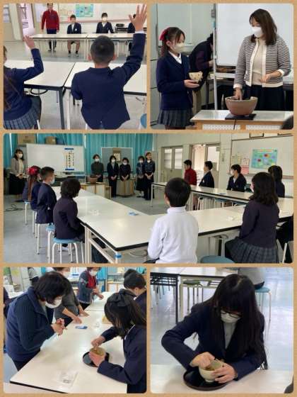 5年生は、東住吉更生保護女性会の方々をお招きして、茶道体験にのぞみました。日本の伝統文化である茶道を体験し、礼儀作法や歴史を学びました。お菓子もいただきながら、お点前(おてまえ)を体験しました。
