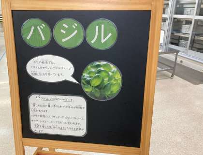 今日の給食では、「ツナとキャベツのバジルソテー」に乾燥バジルを使いました。食欲を増したり、消化をよくしたりする効果があります。