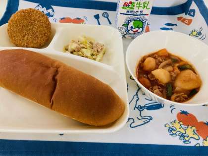 今日の献立は「チキンレバーカツ、ケチャップ煮、ツナとキャベツのバジルソテー、黒糖パン、牛乳」でした。バジルは、シソ科の香草で、青じそに似た甘い香りがします。温かい気候でよく育つため、地中海沿岸で多く栽培されます。トマトと組み合わせて、イタリア料理によく使われます。生の葉をパスタのソースに使ったり、乾燥させて、スープやトマトソースに入れたりします。