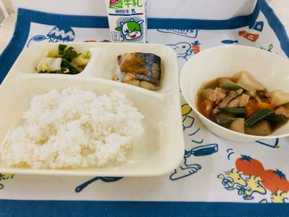 今日の献立は「さごしのおろしじょうゆかけ、さといもと野菜の含め煮、なのはなのおひたし、ごはん、牛乳」でした。【なのはな】は、「なばな(菜花)」や「はなな(花奈)」ともいわれます。1月から3月に旬を迎え、ほろ苦さに特徴がある緑黄色野菜です。葉が黄緑色でやわらかい在来種(和種)と、葉の色が濃く厚みがある西洋種があります。