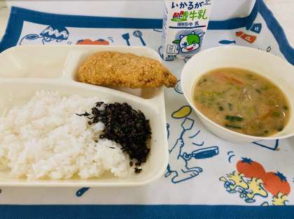 今日の献立は「いわしフライ、みそ汁、牛ひじきそぼろ、ごはん、牛乳」でした。