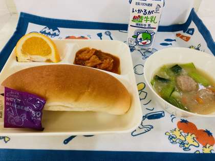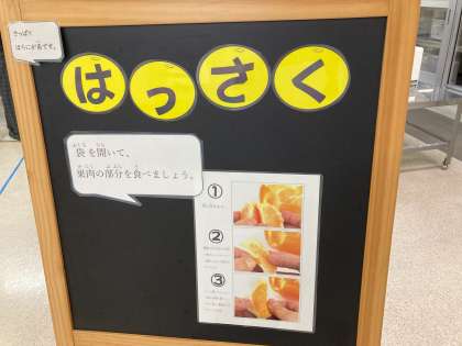 今日の献立は「えびのチリソースいため、中華がゆ、はっさく、コッペパン、ブルーベリージャム、牛乳」でした。はっさくは、広島県で生まれた果物です。風邪の予防や肌の調子を整えるビタミンC、体内の余分な塩分(ナトリウム)の排出を促す働きをするカリウムが多く含まれています。
