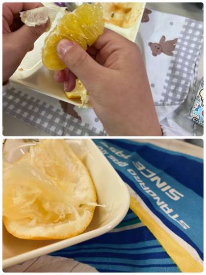 (写真:中)薄皮の袋を開いて、じょうずに果肉の部分を食べていました。