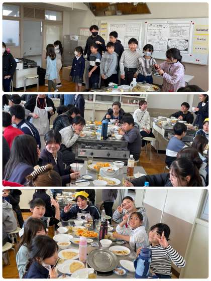 その後、調理室へ移動し、保護者の方々と教職員で協力して作ったチョソンのテンジャン、中国の水餃子を食べました。保護者の方々に作って持ってきていただいたフィリピンのアドボ、ウクライナのブリヌイも、みんなで味わいました。