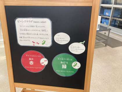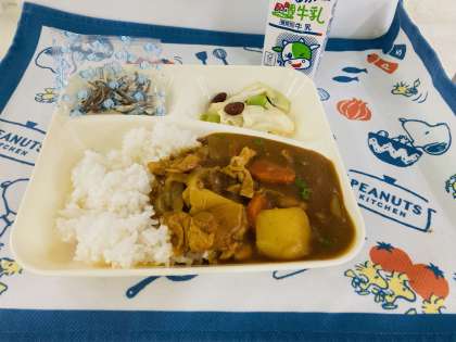 今日の献立は「チキンカレーライス、ビーンズサラダ、ミニフィッシュ、牛乳」でした。「ビーンズ」とは、日本語で「豆」のことです。今日のビーンズサラダには、「金時豆」と「えだまめ」が使われています。酢、うすくちしょうゆ、砂糖、油などで作ったドレッシングであえたいろどりのよいサラダです。