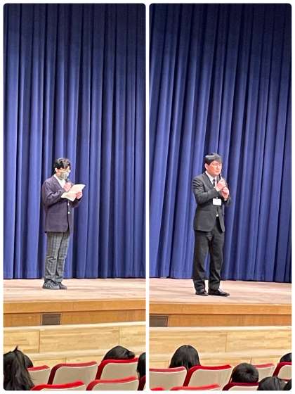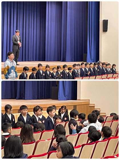 本日全校朝会があり、雨天のため講堂に集まって行われました。はじめに1年生との対面式がありました。1年生は、2年生から9年生までが待ち受けるなか、拍手で迎えられて入場し、大きな声であいさつができました。その後、校長先生からあいさつを習慣として行うことの大切さのお話がありました。