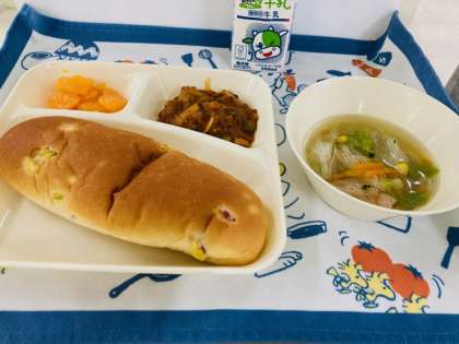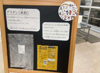 今日の献立は「じゃがいものミートグラタン、レタスのスープ、みかん(缶)、おさつパン、牛乳」でした。今日の給食のグラタンは、上新粉でとろみをつけ、パン粉(米粉)を使った「じゃがいものミートグラタン」でした。