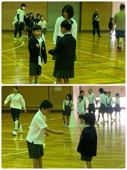 今年度のたてわり班での最初の集会は「ドーンジャンケン」をしました。両端のコーンから同時にスタートし、出会ったらじゃんけんです。勝ったら進んで、相手のコーンにタッチできたら勝ちです。