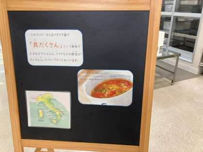 ミネストローネは、イタリア語で「具だくさん」という意味で、たまねぎやにんじん、トマトなどの野菜がたくさん入ったスープのことをいいます。今日の給食では、鶏肉とキャベツ、たまねぎ、トマト、にんじん、にんにく、パセリなどの野菜が使われていました。