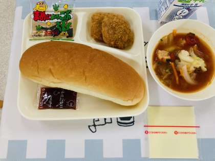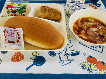 今日の献立は「一口トンカツ、ミネストローネ、豆こんぶ、中学校:スライスチーズ、コッペパン、いちごジャム、牛乳」でした。