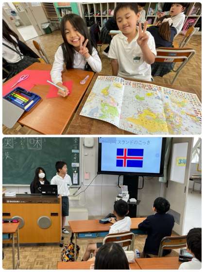 3年生は、それぞれの係に責任をもって活動しています。ショー係は、キレのあるダンスや、難易度の高いマジックを披露してくれました。クイズ係は、みんなが盛り上がるオリジナルクイズを考えて、クラスを盛り上げてくれました。国紹介係は、この日はアイスランドについて調べたことを発表してくれました。