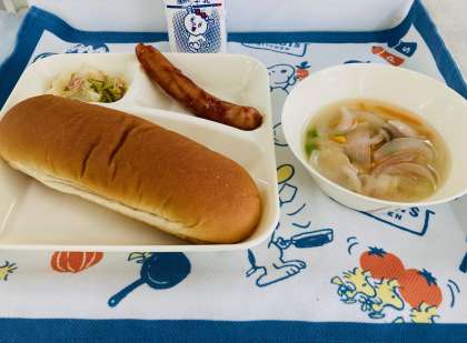 今日の献立は「ウインナーのケチャップソース、スープ、焼きツナキャベツ、黒糖パン、牛乳」でした。
