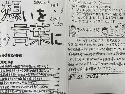 校長先生からも、いじめがどれほど人の心を傷つけるか、いじめに大小はなく、被害者には一生傷が残るものだとお話がありました。終学活ではどうしたらいじめがなくなるかを考え、生徒会ニュースの紙面に意見を書き、投票しました。