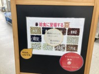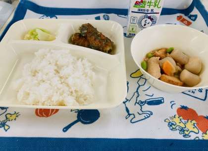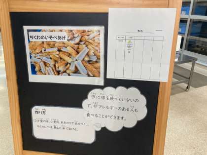 今日の献立は「ちくわのいそべあげ、あつあげとさといものみそ煮、あっさりキャベツ、ごはん、牛乳」でした。ちくわのいそべあげは少量の水、小麦粉、あおのりで衣をつくり、ちくわにつけ、熱した油であげました。衣に卵を使っていないので、卵アレルギーのある人も食べることができます。