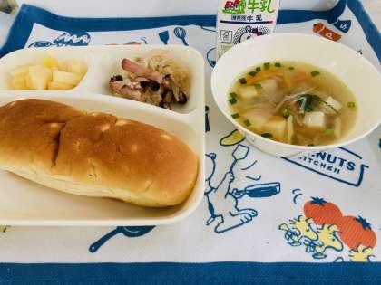 今日の献立は「金時豆の中華おこわ、中華スープ、パインアップル(カットかんづめ)、おさつパン、牛乳」でした。