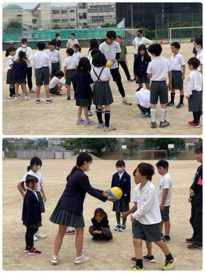 今週の小学部のたてわり班集会は、ボールを回して、ゴロゴロドッカンをしました。真ん中に座っている人の「ゴロゴロゴロゴロ、ドッカン!!」と言うタイミングで、ボールを持っている人と交代していきました。