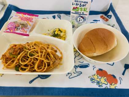 今日の献立は「ミートソーススパゲッティ、レタスとコーンのサラダ、いもけんぴフィッシュ、ミニコッペパン、牛乳」でした。