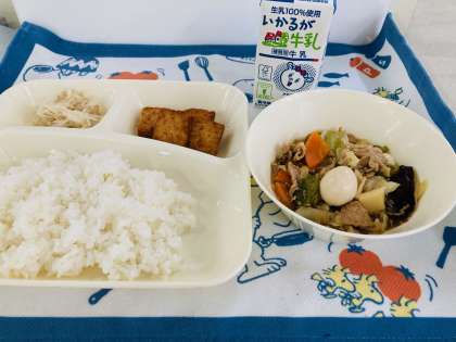 今日の献立は「八宝菜、あつあげのピり辛じょうゆかけ、もやしの中華あえ、ごはん、牛乳」でした。