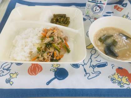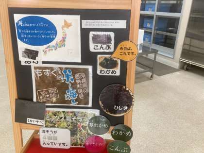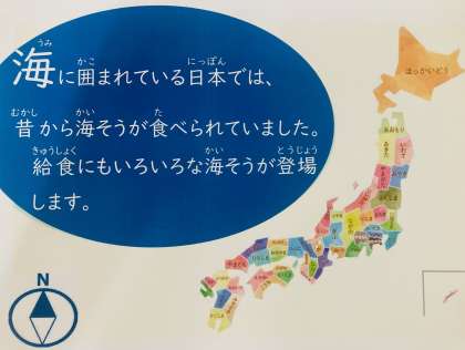 今日の給食は「豚ひき肉とにらのそぼろ丼、じゃがいものみそ汁、さんどまめのごまあえ、牛乳」でした。海に囲まれている日本では、昔から海そうが食べられていました。給食にもいろいろな海そう「のり、こんぶ、わかめ、ひじき、もずく、青のり、ミックス海そう(わかめ、くきわかめ、こんぶ、赤とさかのりの4種類が入っています)」が登場します。