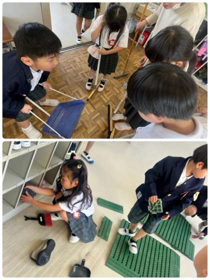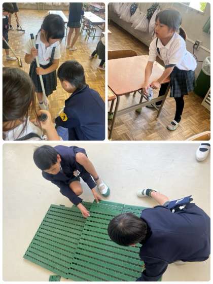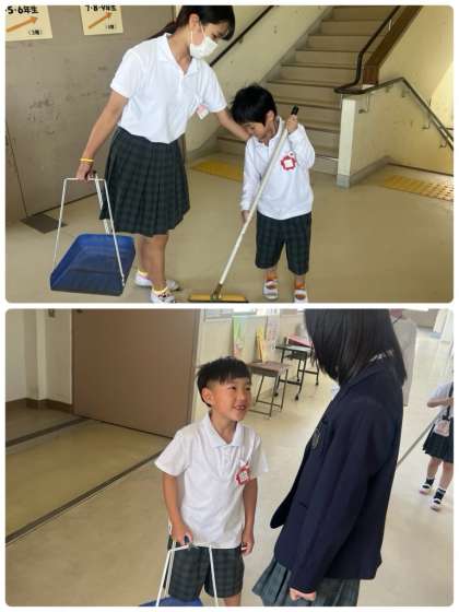 1年生は6年生から、ほうきの使い方や掃除の仕方を教えてもらいました。優しいお兄さんお姉さんの言葉をしっかりと聞いて学び、今では1年生だけで掃除をすることができています。