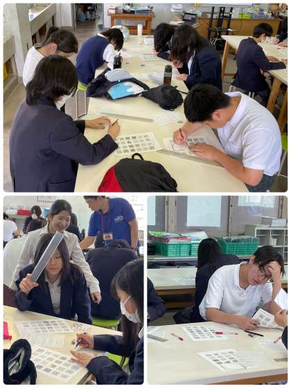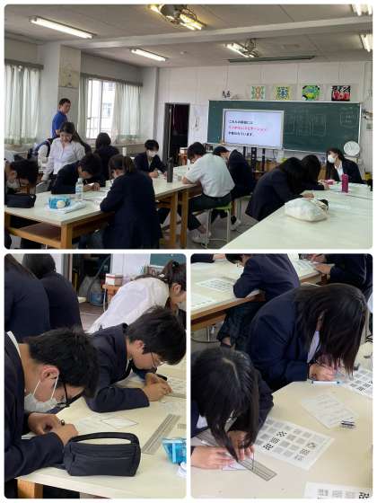 9年生の美術は、教育実習の先生の授業でした。ゼンタングルという、正方形の用紙に点、直線、曲線で色々なパターンを書いてデザインする活動に取り組み、見本を参考に思い思いのパターンを書き込んでいました。