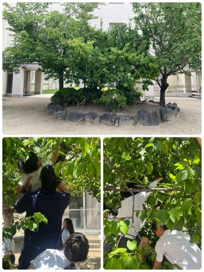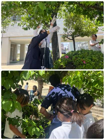 毎年4年生は、本校に植えている立派な梅の木から、実を収穫しています。今年の4年生も、先日収穫祭にのぞみました。かなり高い位置に集中して実がなっている場所は、先生に持ち上げてもらって収穫しました。