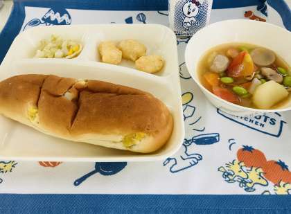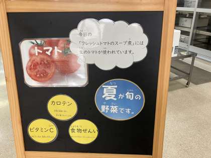 今日の献立は「いかてんぷら、フレッシュトマトのスープ煮、キャベツとコーンのサラダ、おさつパン、牛乳」でした。今日の給食では、「フレッシュトマトのスープ煮」に生のトマトを使いました。