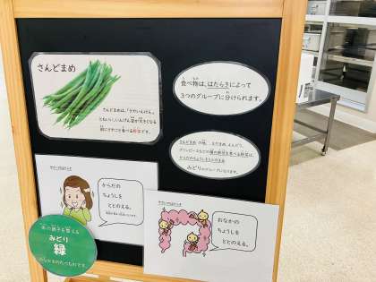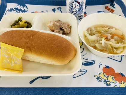 今日の献立は「鶏肉のガーリック焼き、スープ、さんど豆とコーンのサラダ、コッペパン、アプリコットジャム、牛乳」でした。さんどまめは「さやいんげん」ともいい、いんげん豆が大きくなる前にさやごと食べる野菜です。今日は鹿児島県から届いたさんどまめをいただきました。