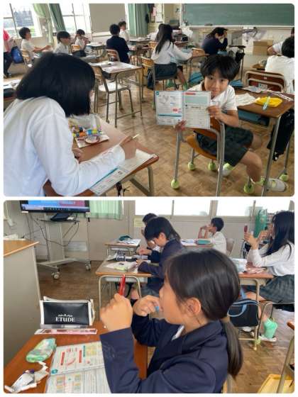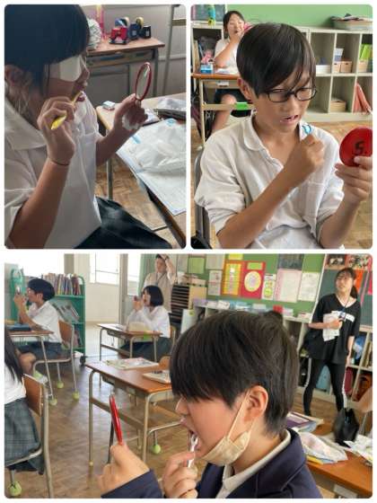 5年生は、歯みがき大会にのぞみました。歯の大切さを学んだあと、鏡で見ながら、まずは歯間ブラシを使っていきました。この日学んだ歯ブラシの正しい使い方を、これからも覚えておきましょう。