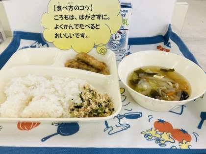 今日の献立は「いわしてんぷら、五目汁、とりなっ葉いため、ごはん、牛乳」でした。