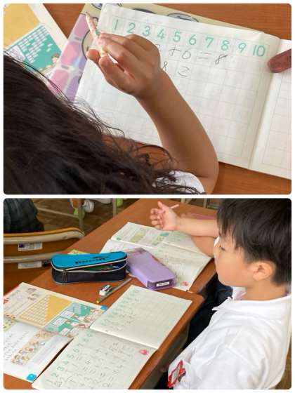 1年生は、「あわせていくつ」「のこりはいくつ」など、色々な計算の学習を進めています。ノートに式を書いて、真剣に考えています。たくさんの新しいことを学ぶことができ、とてもうれしそうです。
