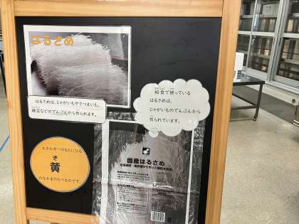 はるさめは、めんのような形をした食べ物です。はるさめは、じゃがいもやさつまいも、緑豆という豆のでんぷんから作られることが多く、給食では、じゃがいも(北海道産)のでんぷんから作られたはるさめを使っています。ツルツルしたはるさめの食感が人気でした。