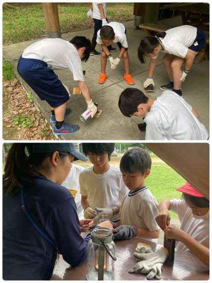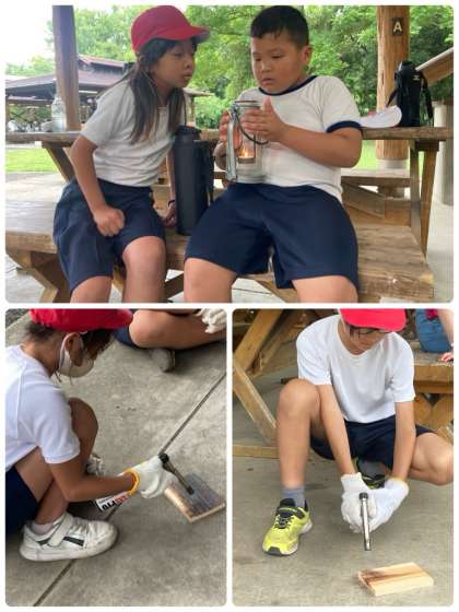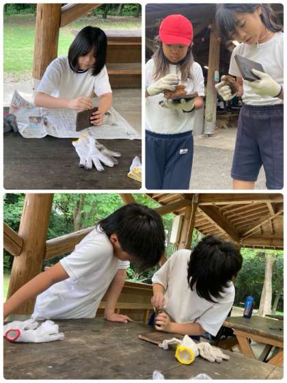 焼き板づくりをしました。バーナーを使って板を焼き、たわしで磨きました。