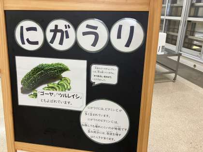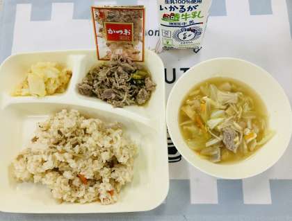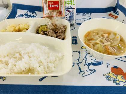 今日の献立は「ゴーヤチャンプルー、五目汁、あげ焼きじゃが、小学校:ごはん、中学校:かやくご飯、牛乳」でした。「チャンプルー」とは沖縄の方言で「ごちゃまぜ」という意味で、いろいろな食材をいためた料理です。今日の給食は、夏が旬の野菜「にがうり(ゴーヤ)」を使ったゴーヤチャンプルーでした。にがうり(ゴーヤ)には、ビタミンCが多く含まれています。