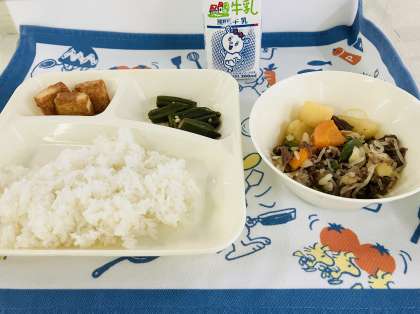 今日の献立は「肉じゃが、あつあげのみそだれかけ、オクラのおかかいため、ごはん、牛乳」でした。オクラの原産地はアフリカ東北部で、エジプトでは古くから食べられていました。切り口が星のような形をした緑色のものが多く出回っていますが、丸い形のものもあります。ビタミン類やカルシウム、食物せんいなどを含む緑黄色野菜です。