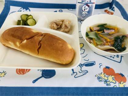 今日の献立は「鶏肉のからあげ、ハムとはるさめのスープ、きゅうりの中華あえ、おさつパン、牛乳」でした。