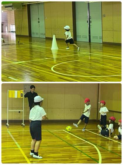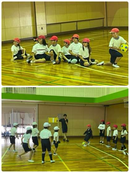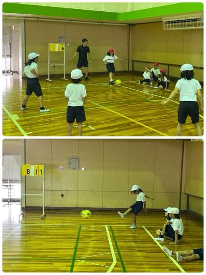 2年生は体育で、ベースボール型ゲームをしました。どこに蹴ったら点数が入りやすいのか考えながら、チームで協力して取り組むことができました。