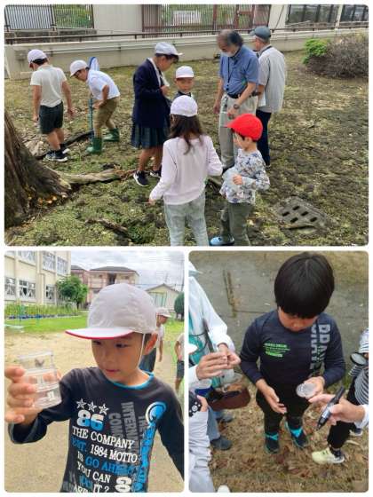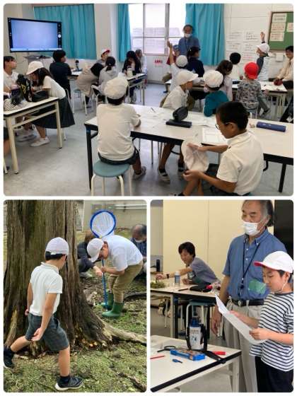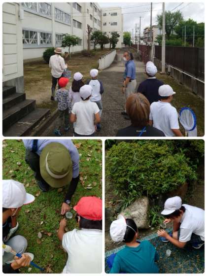 大阪市環境局の方々にご協力いただき、4年生が学校での生き物探しを行いました。班ごとに学校内の各ポイントに分かれて、捕虫網や採集袋を持って生き物を探していきました。合計50種類以上の生き物を学校で見つけることができ、発見した時はとてもうれしそうでした。