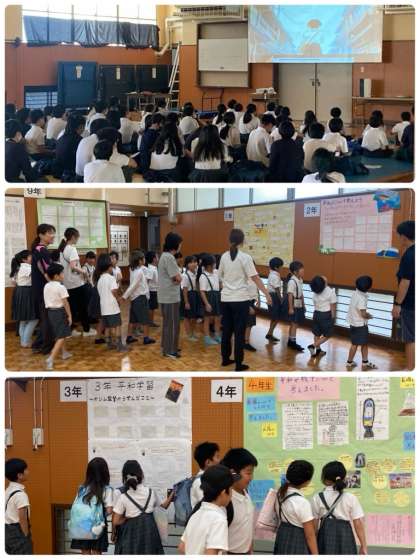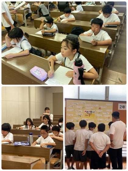 第2部は、学年の取り組み掲示の見学をして、学年ごとに分かれて、ビデオ視聴や感想記入を行いました。戦争のおそろしさや、今の自分たちが当たり前に暮らせていることのありがたさを、あらためて感じている様子でした。