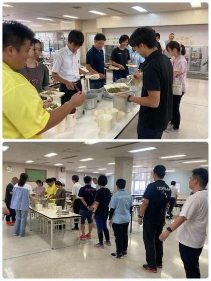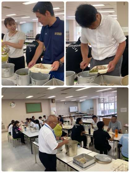 2学期より、本校の給食調理業務の業者が変わります。児童生徒に安心しておいしい給食を届けられるように、教職員で、新しい業者の給食試食会を行いました。豚肉の生姜焼き、すまし汁、ツナ缶とさんど豆の炒め物をいただきました。子どもたちに合う味付けで、教職員一同おいしくいただくことができました。