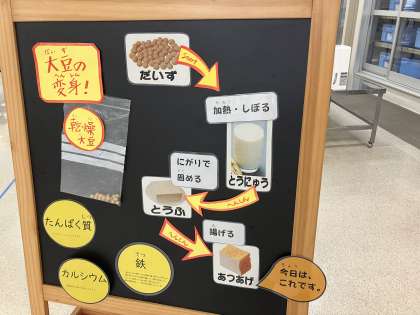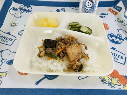 今日の、2学期最初の給食献立は「マーボーあつあげ丼、あっさりきゅうり、りんご(カット缶)、牛乳」でした。あつあげは、大豆が原料の加工食品で、「なまあげ」ともいいます。厚めに切ったとうふの水分を切り、高温の油で揚げます。