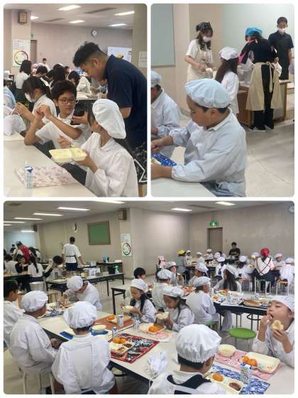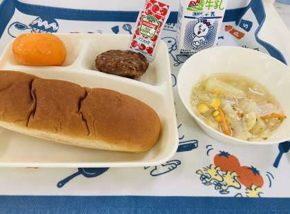 今日の献立は「焼きハンバーグ、豆乳スープ、冷凍みかん、黒糖パン、牛乳」でした。暑い日に、冷たいみかんをうれしそうに食べている姿が印象的でした。