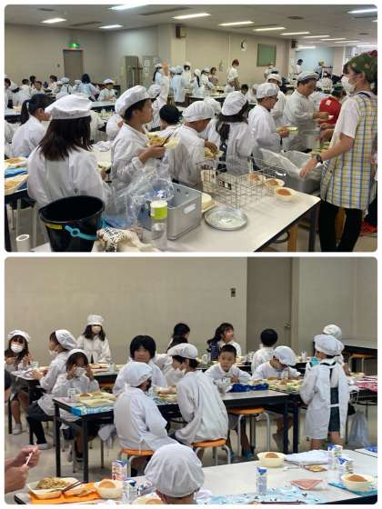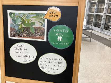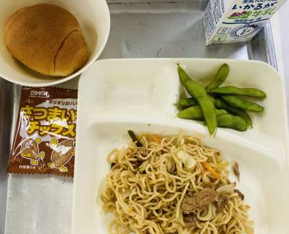 8月30日の献立は「焼きそば、えだまめ、おさつチップス、ミニコッペパン、牛乳」でした。えだまめは、大豆が熟す前のやわらかいころに「たね」の部分を食べる野菜です。体の調子を整える緑のなかまの食べものです。